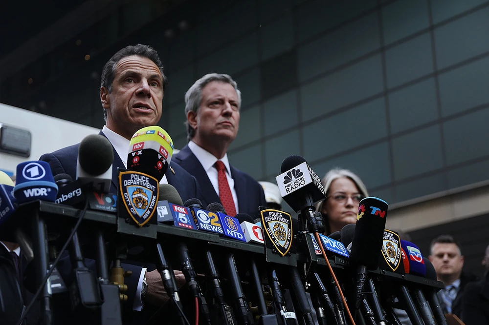 Thống đốc bang New York - ông Andrew Cuomo (trái) và Thị trưởng TP New York - ông Bill de Blasio (kế bên) trong một cuộc họp báo về COVID-19. Ảnh: GETTY IMAGES