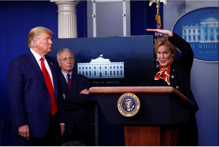 Bác sĩ Deborah Birx, nhà điều phối phản ứng chống dịch của Nhà Trắng (phải), trong cuộc họp báo ngày 31-3, cùng với Tổng thống Donald Trump (trái), Tiến sĩ Anthony Fauci - Giám đốc Viện Các bệnh dị ứng và truyền nhiễm quốc gia (giữa). Ảnh: REUTERS