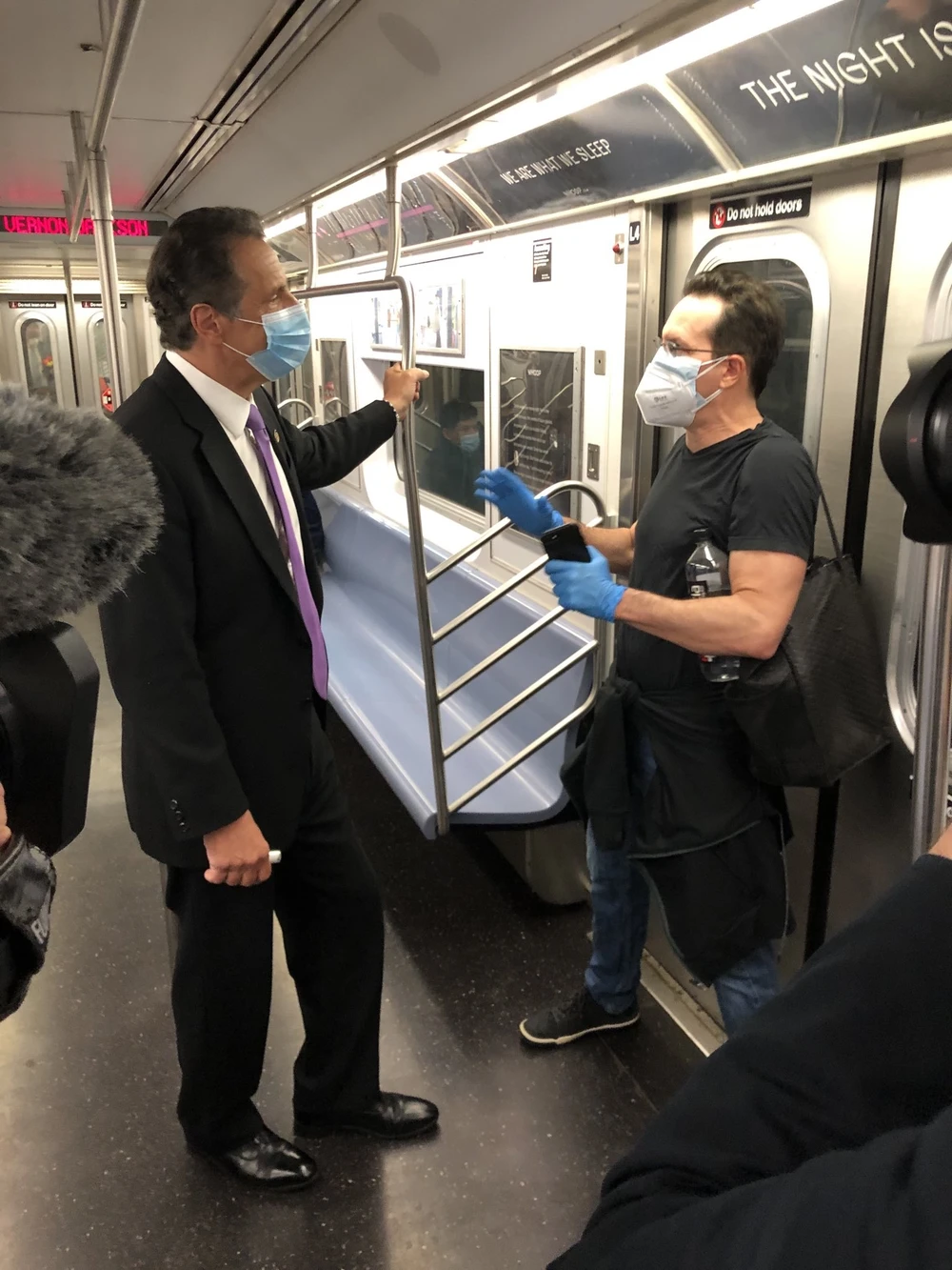 Thống đốc bang New York Andrew Cuomo trò chuyện với người dân TP New York trên tàu điện ngầm hôm 8-6. Ảnh: CNN/TWITTER