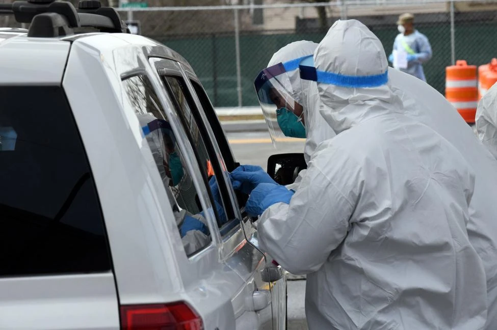Các thành viên Vệ binh quốc gia New York lấy mẫu từ những tài xế tại Trung tâm xét nghiệm di động COVID-19 ở New York. Ảnh: UPI