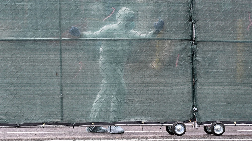 Nhân viên y tế di chuyển một hàng rào đặt trước các xe tải đông lạnh được dùng làm nhà xác tạm thời tại Trung tâm Y khoa Brooklyn ở TP New York hôm 9-4. Ảnh: GETTY
