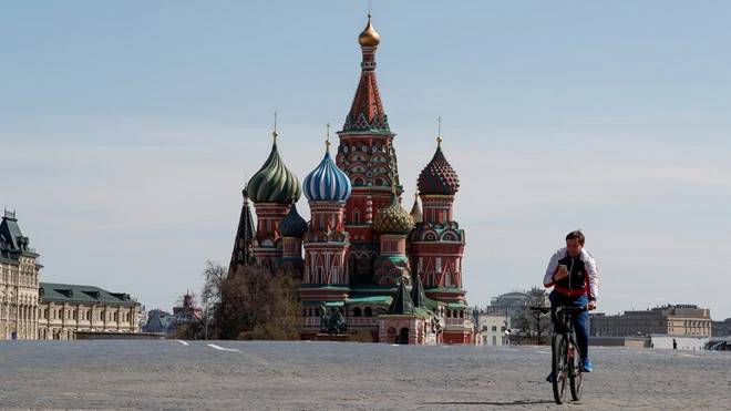 Một người đạp xe ở Quảng trường đỏ vắng người, khi dịch COVID-19 đang bùng phát ở Nga. Ảnh: REUTERS