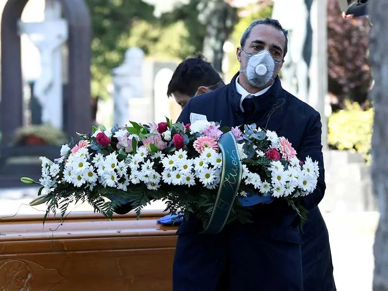 Nhân viên mai táng vận chuyển thi thể một người tử vong vì COVID-19 vào một nghĩa trang ở TP Bergamo, Ý ngày 16-3. Ảnh: REUTERS