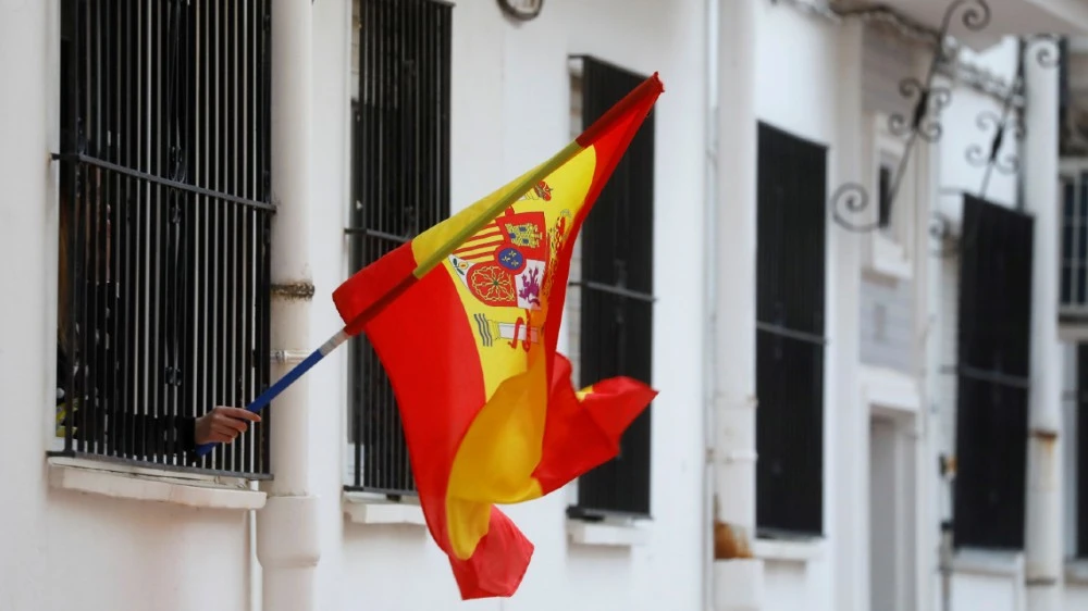 Một phụ nữ treo cờ Tây Ban Nha để bày tỏ sự ủng hộ tinh thần cho các nhân viên y tế ở Ronda, phía nam Tây Ban Nha. Ảnh: REUTERS