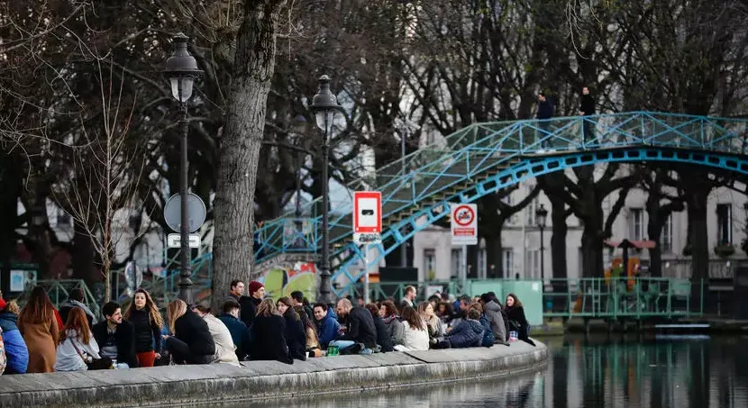 Người dân tập trung tại các bờ kênh đào Saint-Martin ở Paris (Pháp) hôm 25-2 khi các nhà hàng, tiệm cà phê đóng cửa do dịch COVID-19. Ảnh: AFP