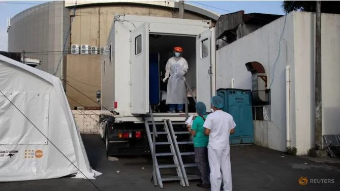 Các nhân viên y tế Philippines tại một buồng xét nghiệm COVID-19 đặt bên ngoài một bệnh viện ở Manila. Ảnh: REUTERS
