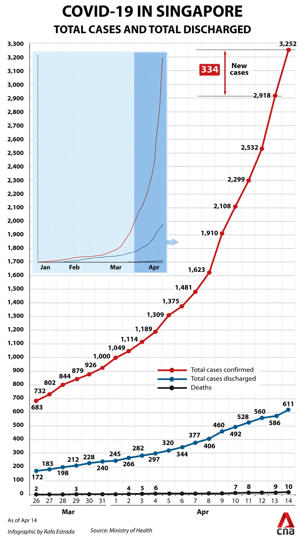 Tính đến 12 giờ trưa 14-4, Singapore đã phát hiện 3.252 ca nhiễm COVID-19, trong đó 10 trường hợp tử vong và 611 bệnh nhân đã được chữa khỏi, đài CNA dẫn thống kê trên trang web của Bộ Y tế Singapore.