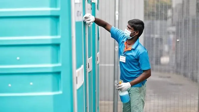 Nhân viên y tế khử trùng bên ngoài một nhà vệ sinh ở ký túc xá Toh Guan của các lao động nước ngoài. Ảnh: CNA