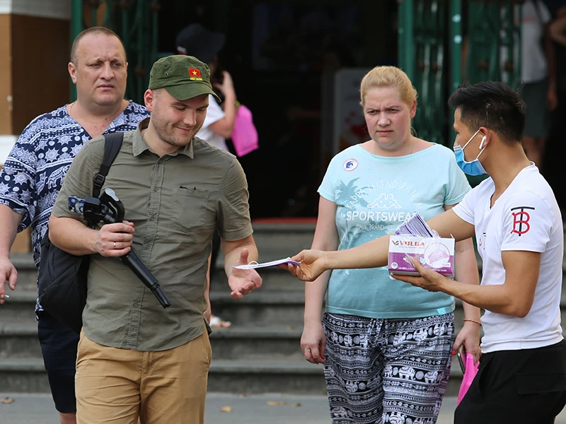 Du lịch là ngành bị ảnh hưởng nặng nhất và cũng là ngành hồi phục chậm nhất vì dịch COVID-19. Trong ảnh: Bạn trẻ phát khẩu trang cho khách du lịch đến tham quan TP.HCM trong mùa dịch. Ảnh: HOÀNG GIANG