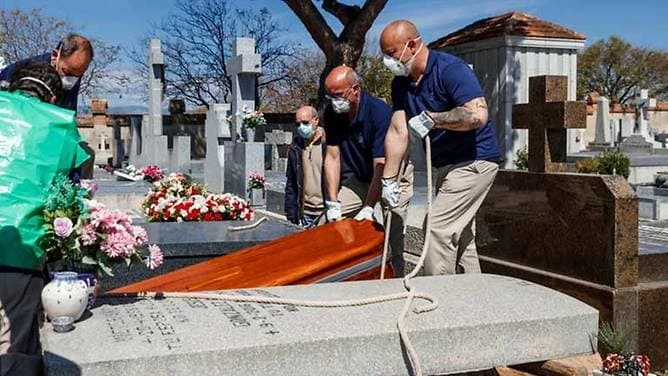 An táng một nạn nhân COVID-19 tại nghĩa trang Fuencarral ở Madrid (Tây Ban Nha). Ảnh: AFP