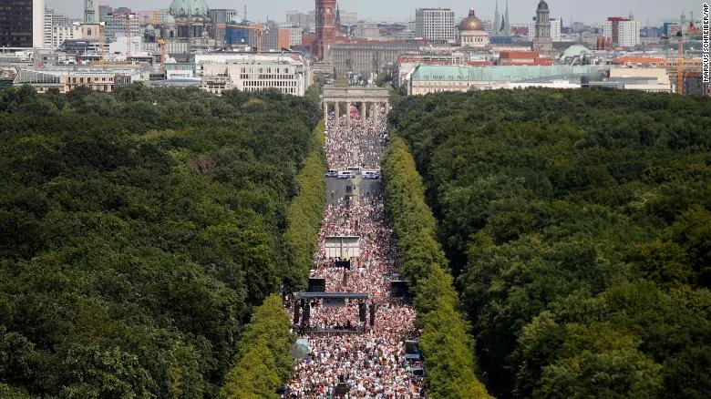 Đám đông này dường như đã bỏ qua các quy tắc giữ khoảng cách an toàn 2 m và không đeo khẩu trang, trong bối cảnh dịch bệnh COVID-19 ở Đức bắt đầu có dấu hiệu tăng trở lại.
