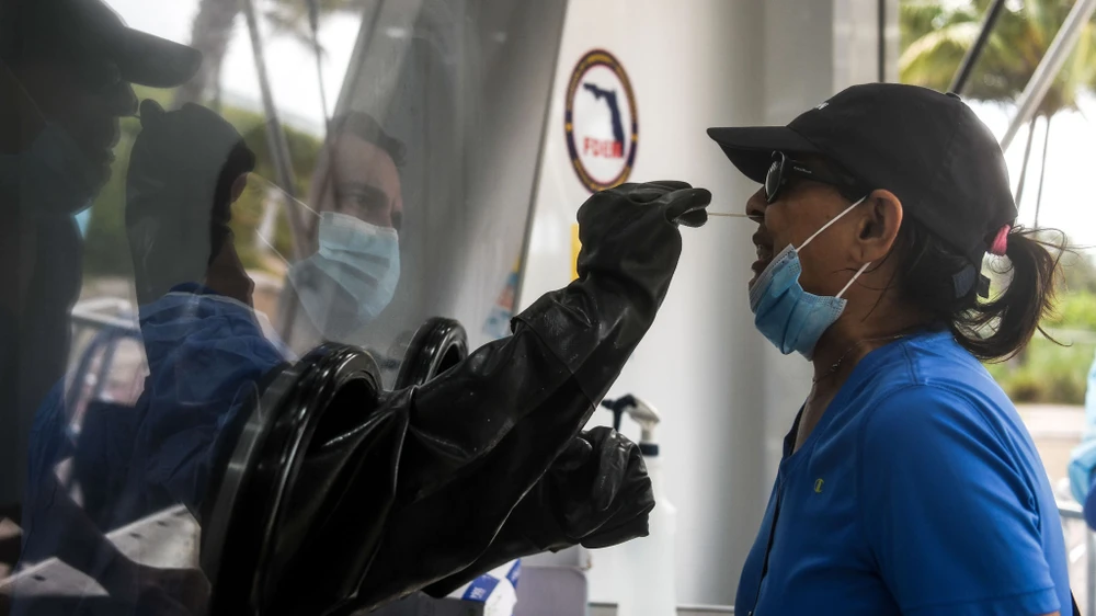 Người dân Mỹ làm xét nghiệm tại một trạm y tế lưu động ở bang Texas (Mỹ) ngày 1-8. Ảnh: AFP