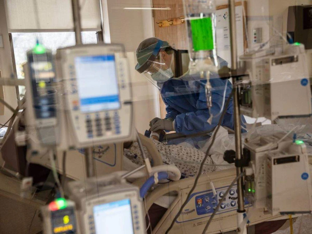 Bệnh nhân COVID-19 được hỗ trợ điều trị bằng máy trợ thở tại một bệnh viện ở bang New York (Mỹ), ngày 2-4. Ảnh: AFP