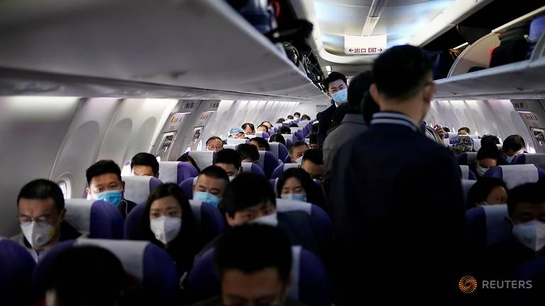 Hành khách đeo khẩu trang trên một máy bay của hãng Shanghai Airlines tại sân bay quốc tế ở Thượng Hải (Trung Quốc) ngày 25-3. Ảnh: REUTERS