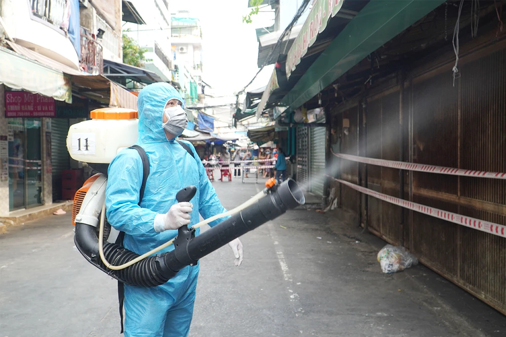 Phun khử khuẩn một đoạn đường Hồ Thị Kỷ (quận 10, TP.HCM) do liên quan ca tái dương tính COVID-19. Ảnh: MINH TÂM