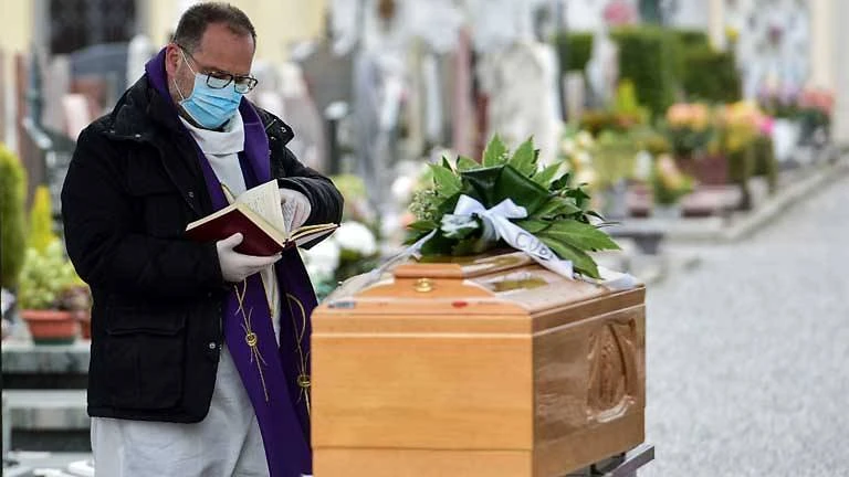 Một linh mục mang khẩu trang cầu nguyện cho một người vừa qua đời ở một lễ tang tại nghĩa trang TP Bolgare, vùng Lombardy (Ý). Ảnh: AFP
