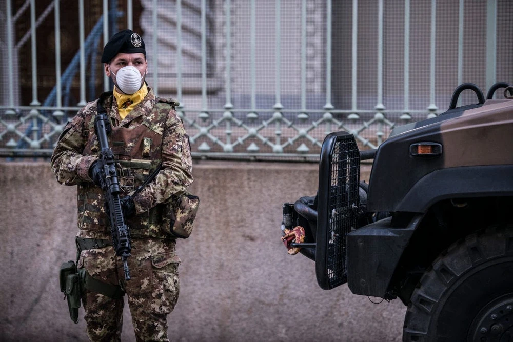 Một sĩ quan quân đội làm nhiệm vụ kiểm soát việc thực hiện lệnh phong tỏa ở Ý. Ảnh: GETTY IMAGES