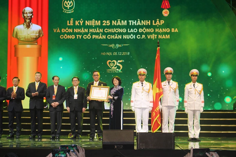 Sáng 5-12, tại Hà Nội, nhân dịp kỷ niệm 25 năm thành lập, Công ty Cổ phần Chăn nuôi C.P. Việt Nam (C.P. Việt Nam) đã được lãnh đạo Nhà nước trao tặng huân chương Lao động hạng III. Đây là sự ghi nhận kết quả hoạt động xuất sắc và những đóng góp tích cực của C.P. Việt Nam trong lĩnh vực nông nghiệp sau 25 năm đầu tư và phát triển tại Việt Nam.