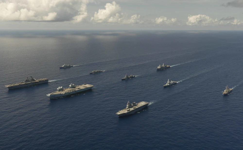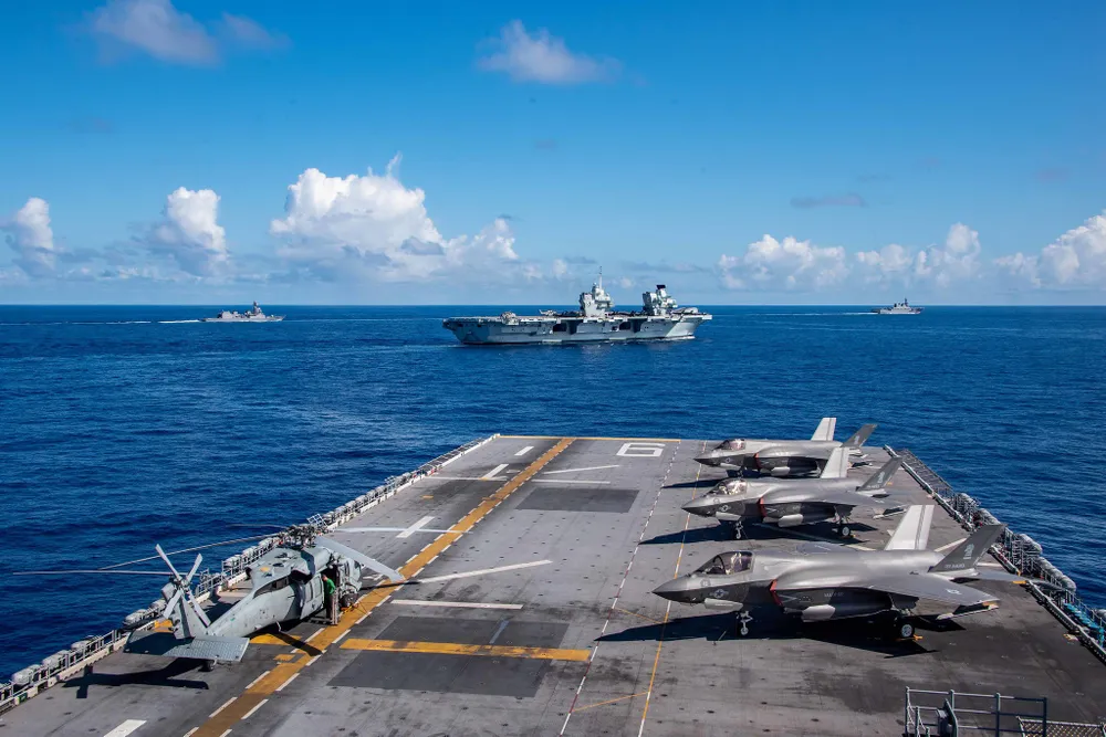 Nhóm tác chiến tàu sân bay của Anh và tàu USS America của Mỹ trong cuộc tập trận Large-Scale Exercise (LSE) 2021. Ảnh: HẢI QUÂN MỸ