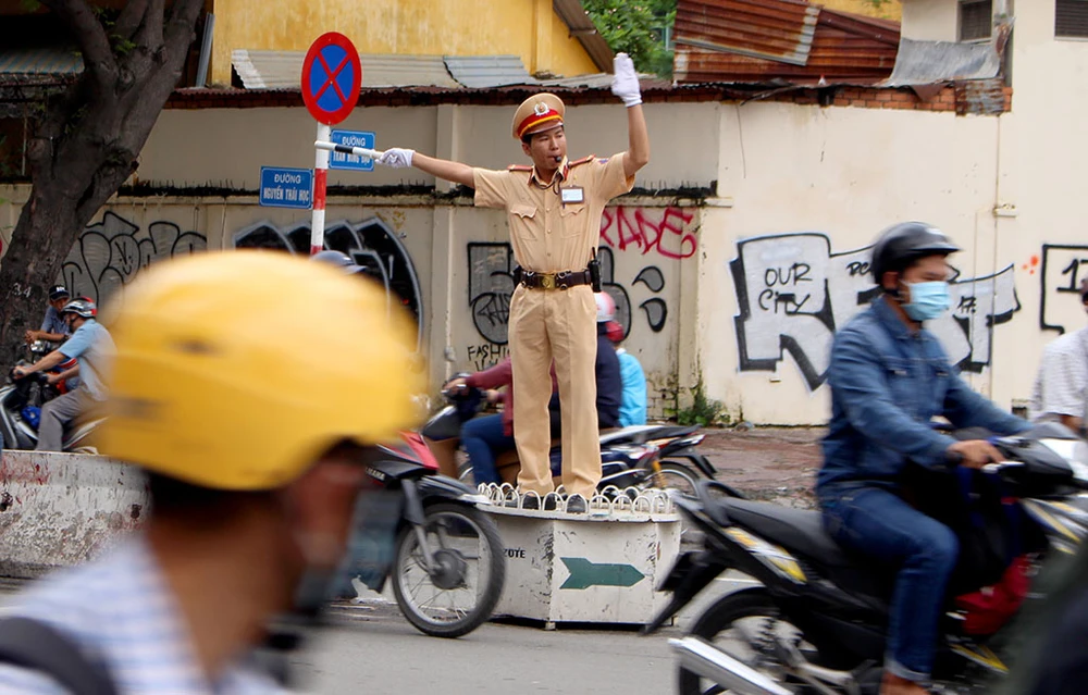 Chiều 5-6, Trung úy Nguyễn Minh Khoa (25 tuổi) được phân công phụ trách điều hòa giao thông tại ngã tư Trần Hưng Đạo – Nguyễn Thái Học (quận 1, TP.HCM).