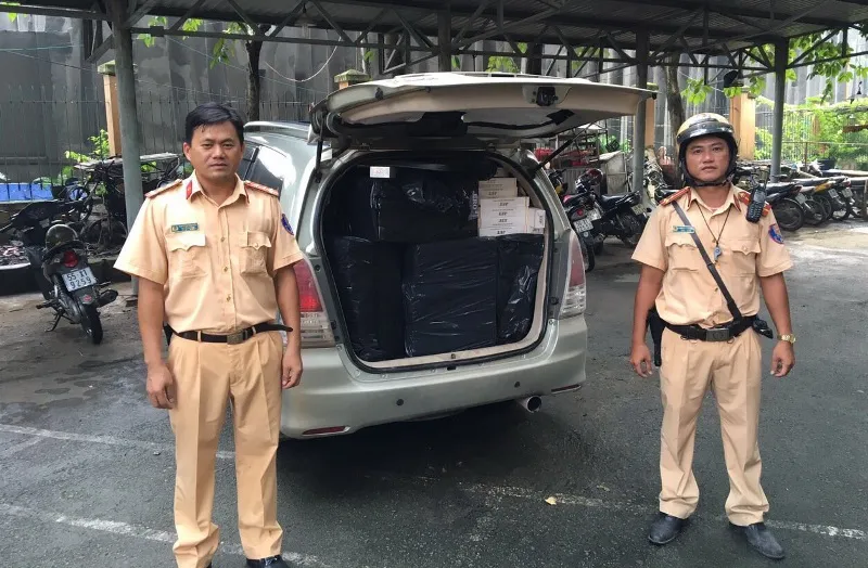 Sáng 24-8, Đội CSGT Rạch Chiếc (Phòng CSGT đường bộ - đường sắt Công an TP.HCM) đã bàn giao cho Công an quận 9 hai nghi can có hành vi buôn lậu, vận chuyển hàng cấm cùng tang vật gồm: một ô tô hiệu Innova, 1.680 cây thuốc lá và hung khí (mã tấu, dao bầu, ống tuýp sắt) để điều tra làm rõ.