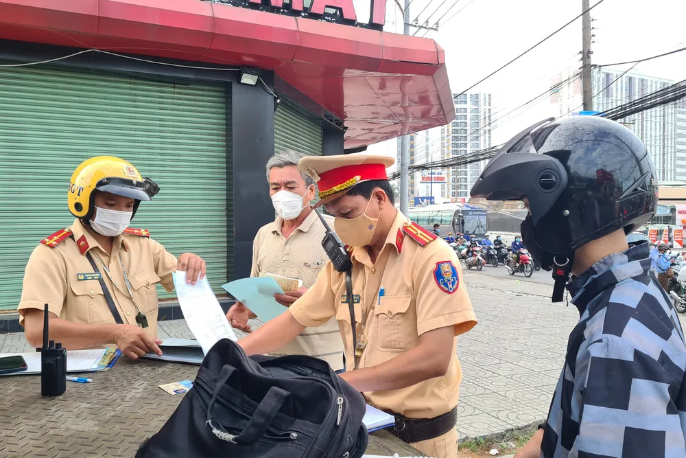 Lực lượng CSGT xử phạt các trường hợp vi phạm giao thông trong sáng 15-12. Ảnh: LÊ ÁNH