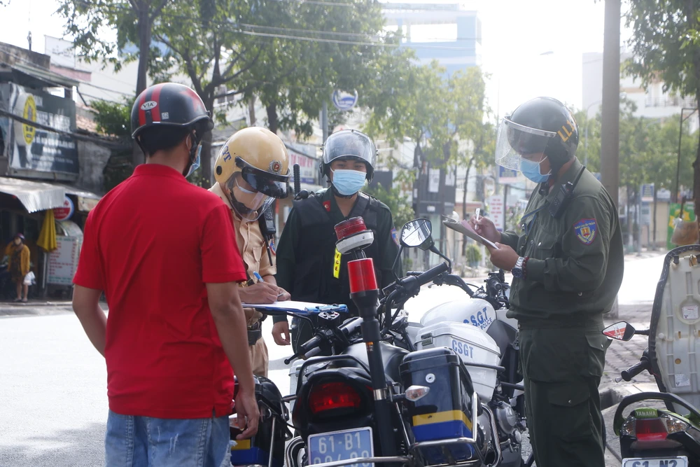 Lực lượng công an tuần tra, xử phạt người dân ra đường không lý do. Ảnh: LÊ ÁNH