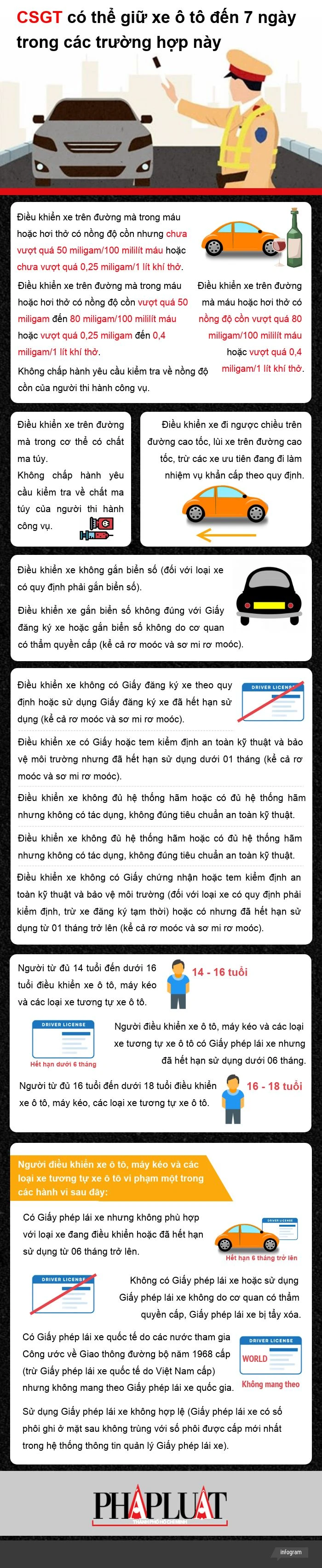 (PLO)- Ngoài bị xử phạt hành chính khác, người điều khiển xe ô tô thuộc các trường hợp dưới đây có thể bị CSGT giữ xe đến 7 ngày.