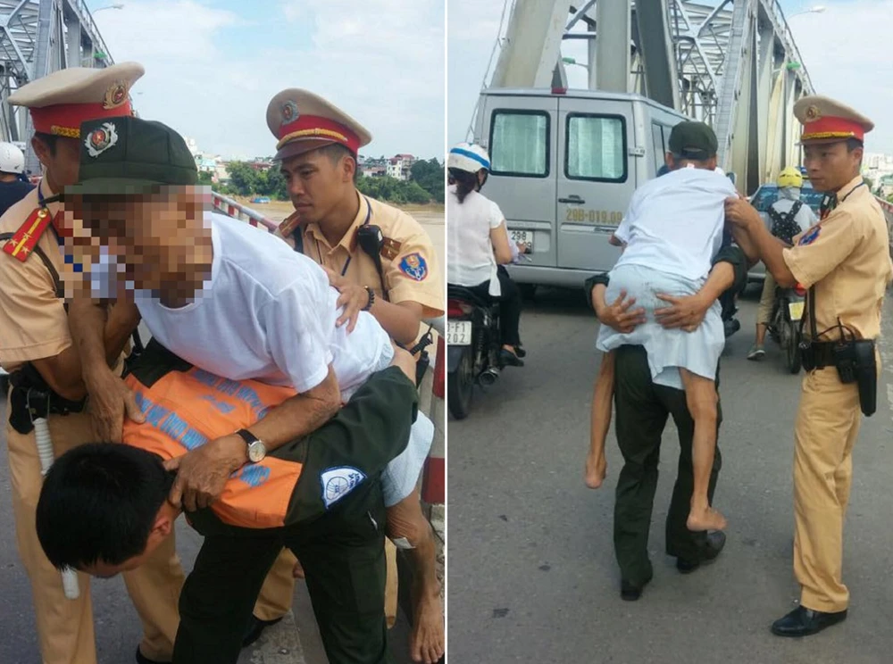 Ngồi trên mặt cầu, cụ ôm lấy cán bộ CSGT rồi khóc lóc, đòi được chết. Phải sau một hồi khuyên nhủ, cụ mới đồng ý để tổ công tác cõng về trụ sở công an phường Bồ Đề.