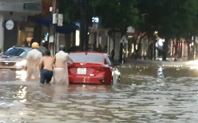 Chiều tối 18-9, CSGT đang giúp dân đẩy xe ô tô con bị ngập trong nước ở TP Vinh (Nghệ An). Ảnh: Đ.LAM