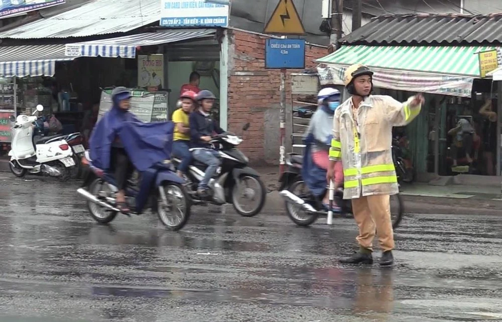 CSGT TP.HCM túc trực trước các điểm thi để điều tiết giao thông dù trời mưa hay nắng. Ảnh: M.VƯƠNG.