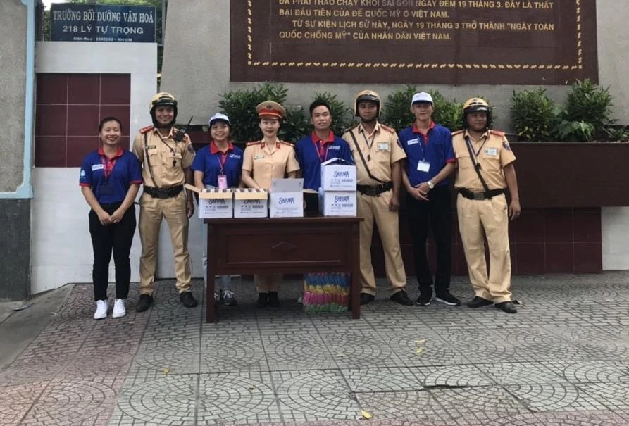 CSGT tặng nước uống trước các điểm thi, tiếp sức cho sĩ tử. Ảnh: M.VƯƠNG