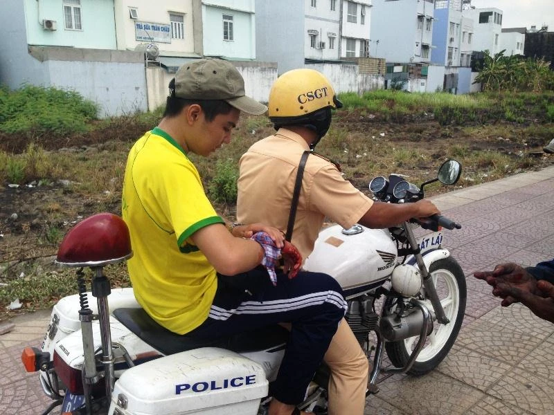 Cú va chạm khiến nam sinh bị thương ở cánh tay phải, chảy nhiều máu. Lúc này, đang trên đường tuần tra, một chiến sĩ CSGT Đội Cát Lái (thuộc Phòng CSGT đường bộ - đường sắt, Công an TP.HCM) đã nhanh chóng dừng lại cùng người đi đường sơ cứu cho em học sinh. Sau đó chiến sĩ này đã đưa nam sinh đến bệnh viện cấp cứu.