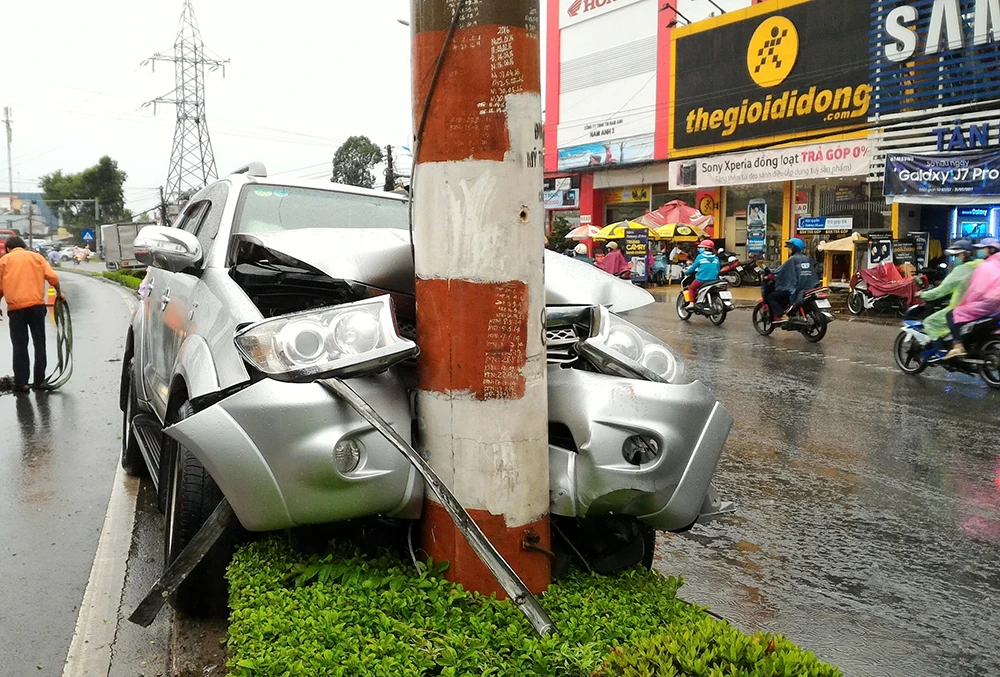 Khi đến địa điểm trên, bất ngờ ô tô leo lên dải phân cách cứng rồi ủi thẳng vào trụ cột điện cao thế, phần đầu xe bị biến dạng.