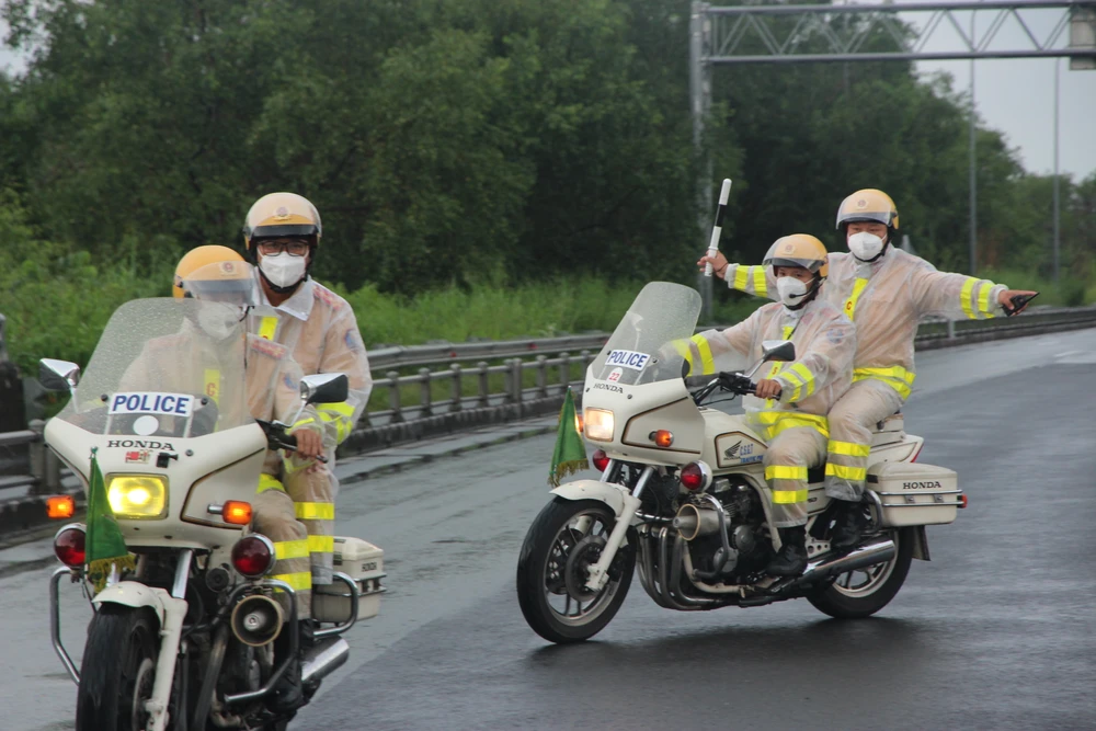 Đại uý Nguyễn Xuân Văn, Phó đội trưởng Đội tuần tra dẫn đoàn Công an TP.HCM chào điều lệnh đoàn tình nguyện viên tỉnh Lâm Đồng khi trên cao tốc vào địa phận TP.HCM. Ảnh: TS