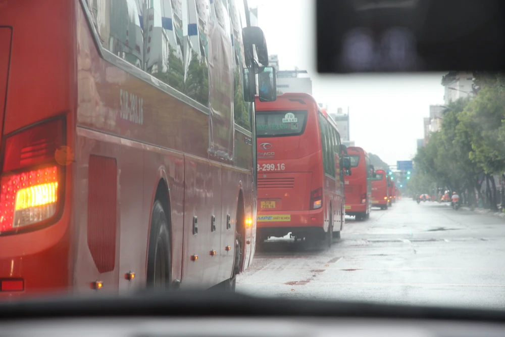 Đoàn 14 chiếc xe khách giường nằm di chuyển đến địa phận quận 1. Ảnh: TS