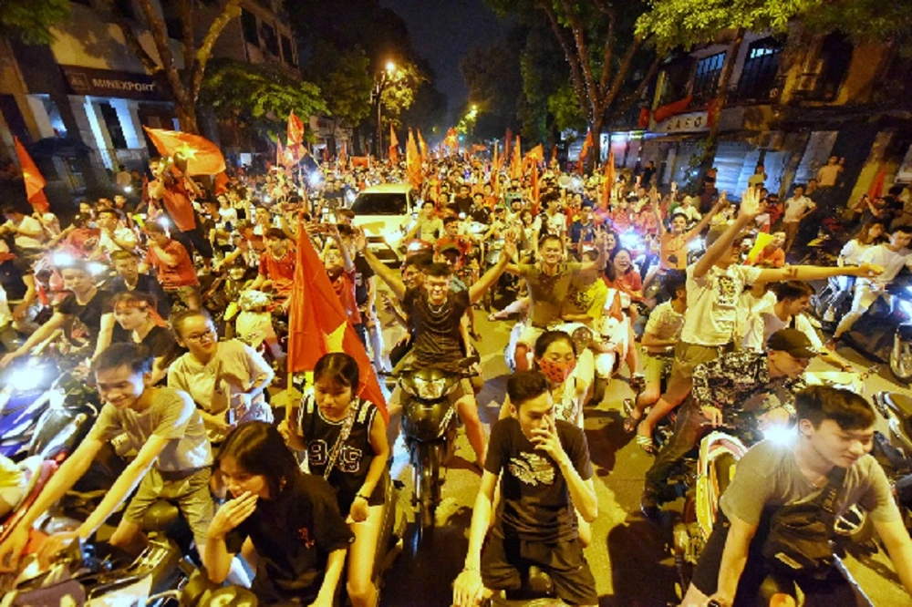 Cổ động viên ăn mừng sau trận thắng của Olympic Việt Nam trước Olympic Syria. Ảnh: VNE