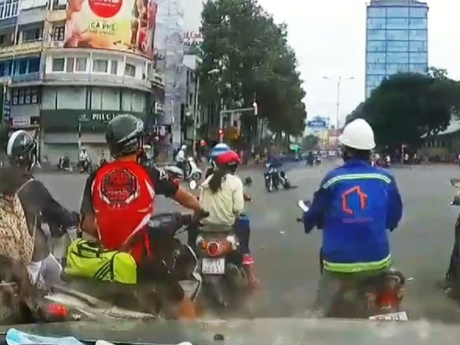 Qua liên hệ, người đăng clip là anh NN cho biết sự việc xảy ra khoảng 6 giờ 30 ngày 19-4 tại giao lộ Nguyễn Thái Học-Trần Hưng Đạo (quận 1, TP.HCM) và được camera hành trình trên ô tô của anh N. ghi lại.