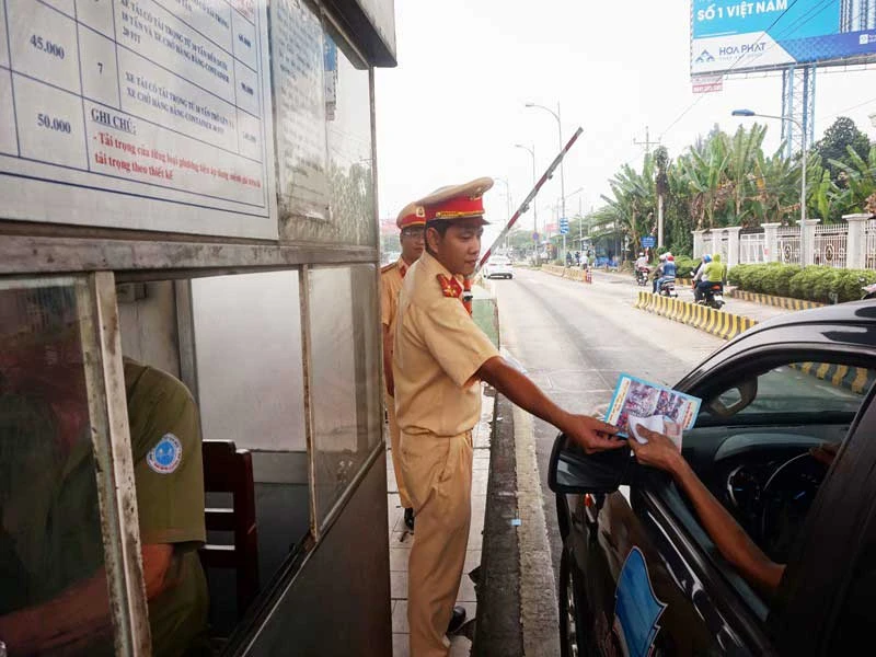CSGT phát tờ rơi tại trạm thu phí cầu Rạch Miễu. Ảnh: ĐÔNG HÀ
