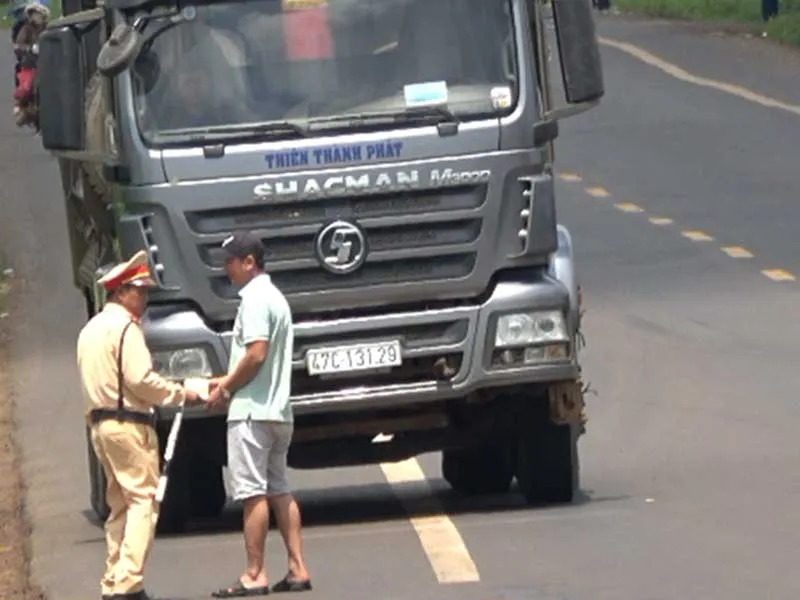 Kiểm tra xong xe khách, một chiếc xe tải biển số 47C… chạy ngang, trung úy CSGT giơ gậy, tài xế nhanh chóng dừng xe, cầm giấy tờ chạy đến trình. Chỉ mất tám giây cuốn sổ được trả lại cho tài xế sau khi trung úy CSGT này dùng tay có chiếc gậy điều khiển giao thông mở cuốn sổ.
