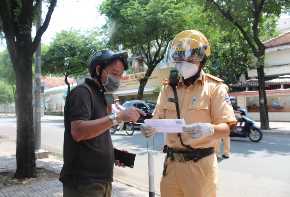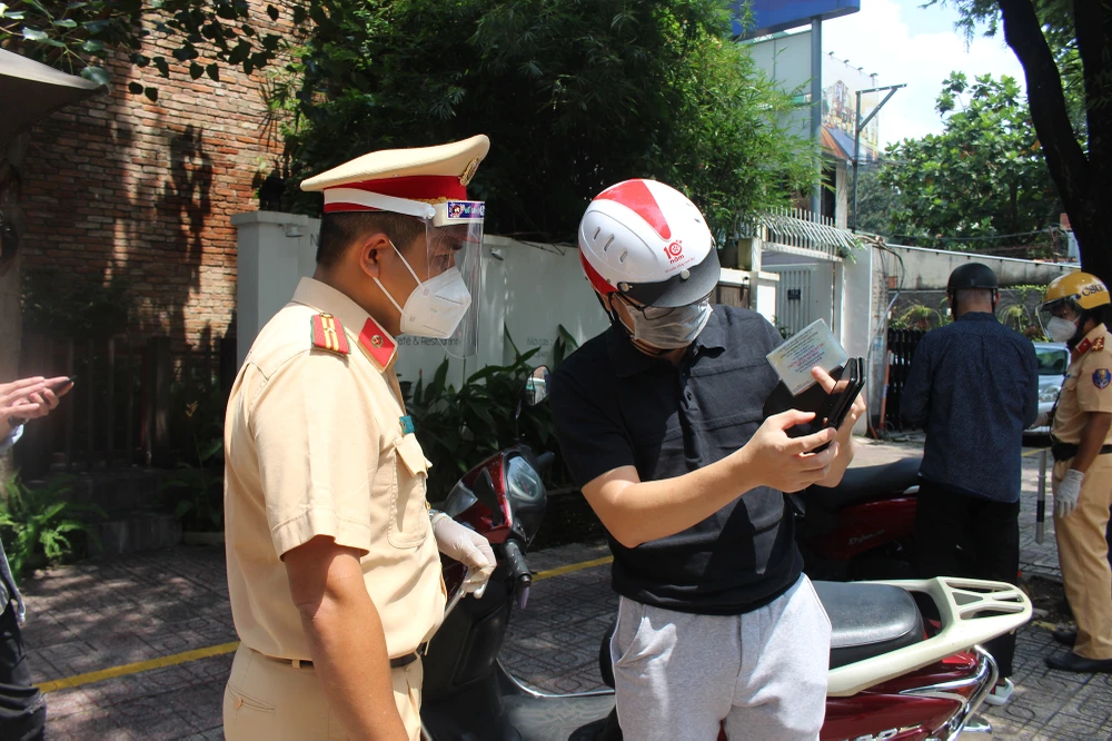 Người dân cung cấp mã QR qua phần mềm VNEID cho CSGT xem tại chốt kiểm tra trên đường Võ Văn Tần.