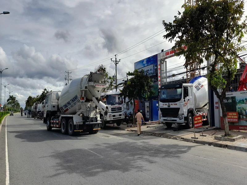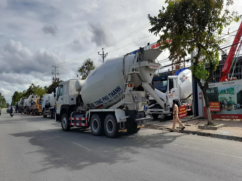 Thời điểm lập biên bản vi phạm, đoàn xe này đang “dàn trận” chiếm mặt đường quốc lộ 60 (đoạn qua xã Tam Phước, huyện Châu Thành, Bến Tre) để đổ bê tông cho một công trình tư nhân ở đó.