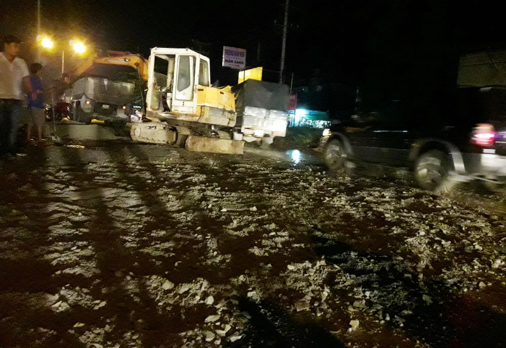 Đến 22h30 cùng ngày, mặt đường đã được san lấp lại bằng phẳng, các phương tiện lưu thông qua khu vực thoải mái và ổn định hơn.