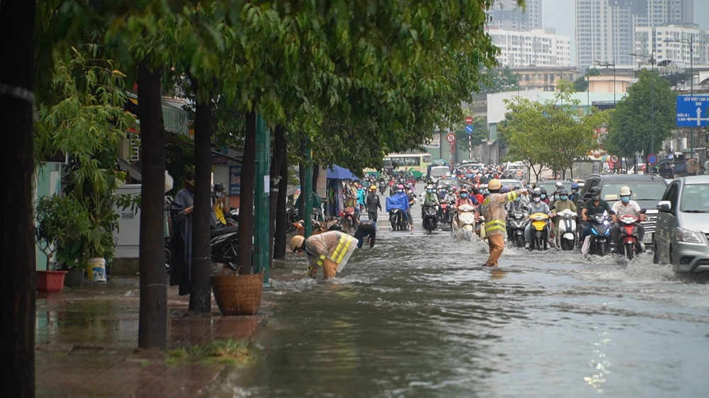 CSGT nhặt rác, khơi thông miệng cống chống ngập trên đoạn đường Phạm Văn Đồng. Ảnh: MINH TÂM