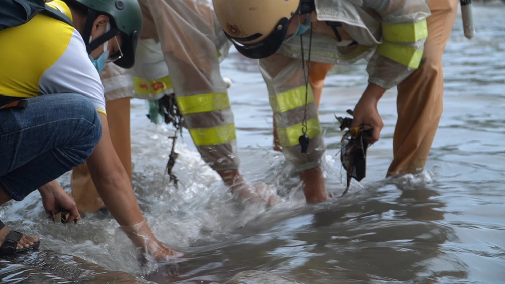 Anh Nguyễn Văn Tuấn, ngụ quận Bình Thạnh, đang trên đường về nhà, đi ngang đoạn đường này thấy CSGT cùng mọi người đang khơi thông cống liền để xe lên lề đường, lao ra phụ giúp mọi người.