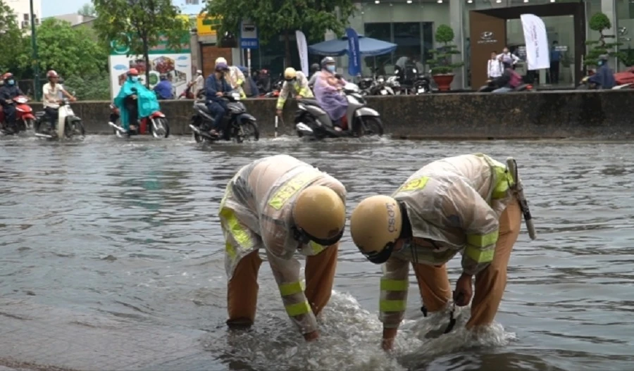 Đặc biệt, trên đoạn đường Phạm Văn Đồng phóng viên bắt gặp hình ảnh rất dễ thương của lực lượng CSGT đang lội nước khơi thông miệng cống để chống ngập, giúp bà con di chuyển dễ dàng hơn.