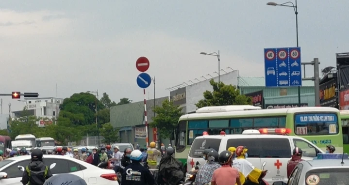 Tại khu vực đường Phạm Văn Đồng giao Tô Ngọc Vân, giao thông ở đây hết sức hỗn loạn, lực lượng CSGT phải có mặt để điều tiết, các phương tiện đợi rất lâu mới di chuyển được.