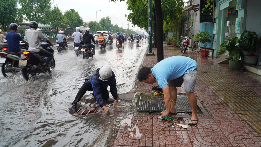 Người dân xung quanh nhặt rác để nước thoát nhanh hơn. Ảnh: MINH TÂM