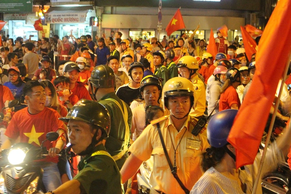 22 giờ ngày 15-12, khắp các tuyến đường trên địa bàn quận 1 chật ních người. Dòng người hâm mộ liên tục thổi kèn, đốt pháo, hô vang khẩu hiệu “Việt Nam vô địch”, “Việt Nam chiến thắng”.