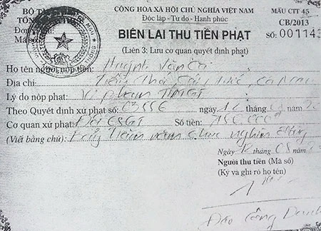 Theo ông Ca, khi ông nộp tiền không có biên lai nhưng ngày 30-8 lại xuất hiện cái biên lai ghi ngày 12-8; ông không ký vào biên bản vi phạm nhưng trong biên bản này lại có tên ông.